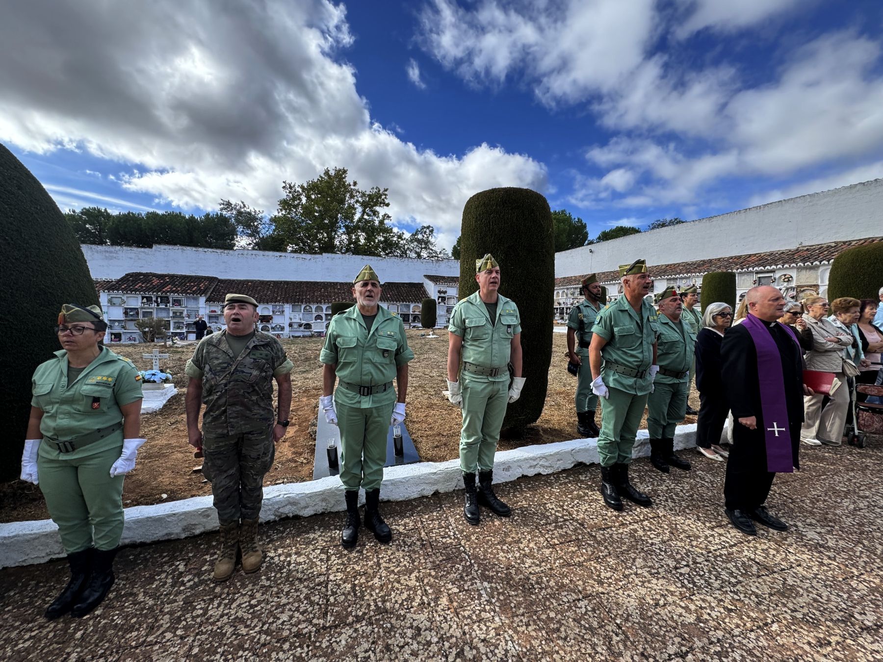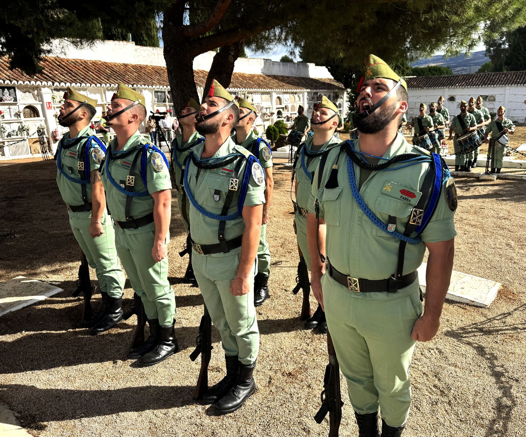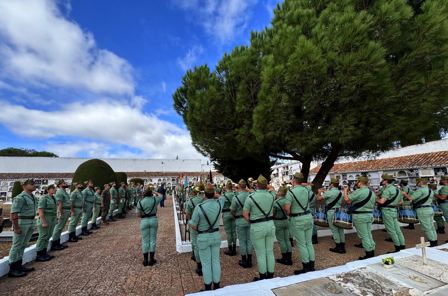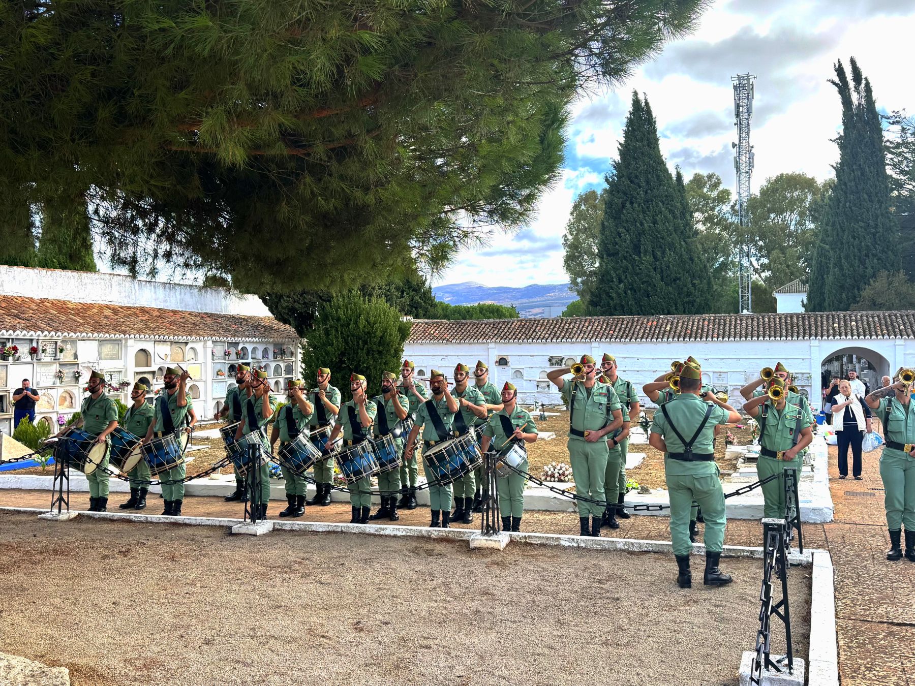 La parcela militar, localizada en el patio 2 del Cementerio de San Lorenzo, ha acogido esta mañana el acto que organiza anualmente La Legión en Ronda para recordar a sus caídos, que ha contado con la presencia del coronel Fernando Sánchez, jefe del Tercio Alejandro Farnesio; el teniente coronel Miguel Ángel Carnerero, jefe de la X Bandera Milán-Astray; la capitán Victoria Reynolds, en representación del Grupo de Caballería Ligero Acorazado Reyes Católicos; el teniente coronel José Emilio Santamaría, al frente de la Unidad de Servicios del Acuartelamiento (USAC Montejaque); el nuevo jefe de la Plana del 4º Tercio, el teniente coronel Alfonso Arenas; o el suboficial mayor del 4º Tercio, Bruno Conejo, además de la Banda de Guerra, comisiones, escuadra y guiones y banderines de las unidades de La Legión en nuestra ciudad.