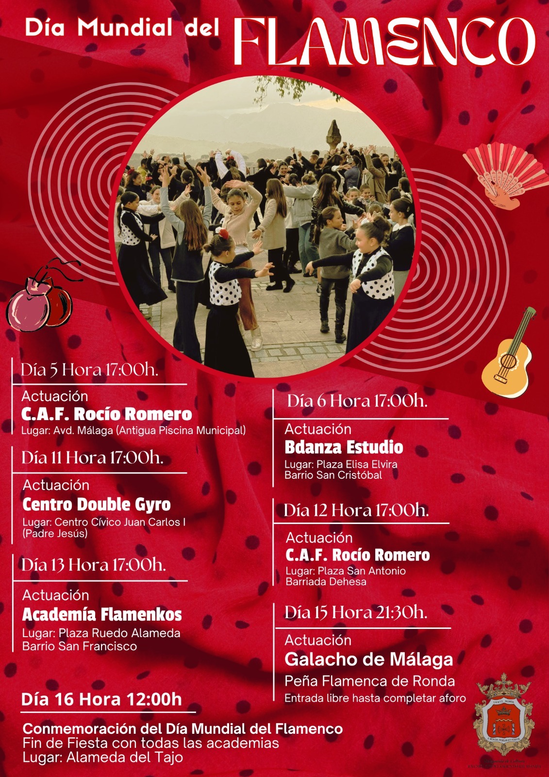 Ya el día 15, la Peña Flamenca de Ronda organizará la actuación de Galacho de Málaga, con entrada libre hasta completar aforo en su sede, a las 21:30 horas. Al día siguiente, jornada en la que se conmemora el Día Mundial del Flamenco, se realizará una fiesta, a las 12:00 horas, que contará con la actuación de las citadas academias en la Alameda del Tajo.