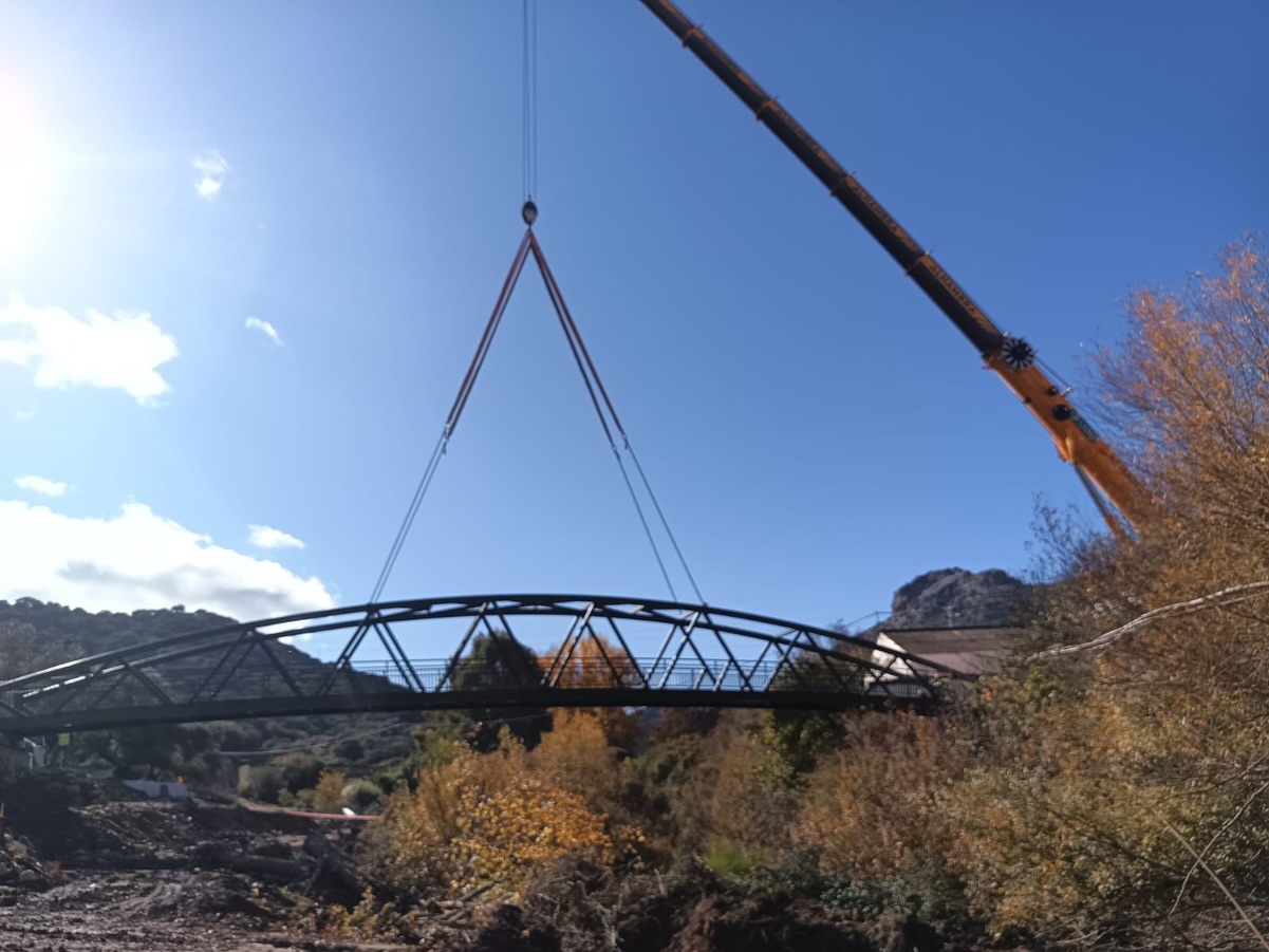 Ayer se inició en la Estación de Benaoján la instalación del nuevo puente sobre el río Guadiaro, que viene a sustituir el que se derrumbó en octubre de 2018 como consecuencia de la crecida del cauce. Se trata de una pasarela peatonal metálica, con estribos de hormigón armado, que ha sido financiada por la Diputación de Málaga con un coste cercano a los 300.000 euros.