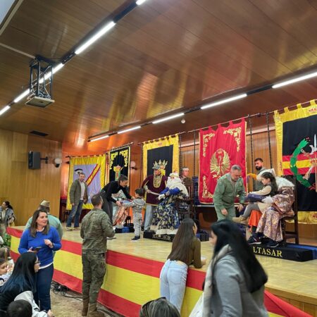 Melchor, Gaspar y Baltasar han desfilado en vehículos pesados, lanzando regalos y caramelos a los presentes. Finalmente, Sus Majestades han recibido a cada uno de los menores en el Salón de Actos, donde les han entregado un pequeño obsequio.
