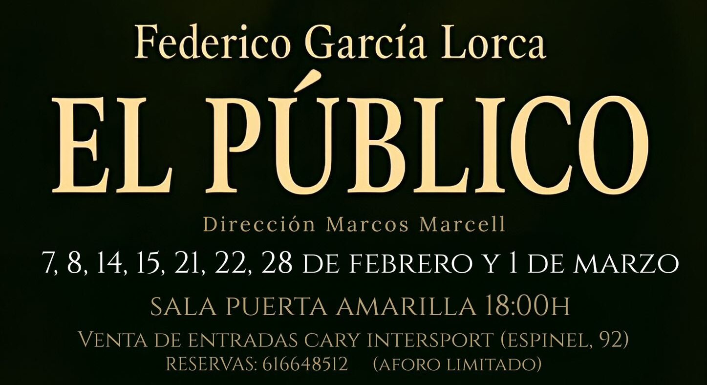 La Sala Puerta Amarilla situada en calle Bulerías, 4, acogerá durante los meses de febrero y marzo la representación de «El Público», una de las obras más complejas y radicales de Federico García Lorca, a cargo de La Pequeña Compañía de Proyecto Platea.