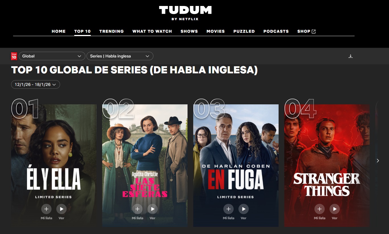 Dos semanas después de su estreno, la serie de Netflix ‘Agatha Christie: Las siete esferas’ sigue posicionándose como una de las más vistas de la plataforma, estando en el top 10 de 80 países esta semana y siendo la segunda serie de habla inglesa más vista a nivel global, con un total de 9.900.000 visualizaciones, según ha publicado Netflix en Tudum, el portal oficial de este servicio de streaming.