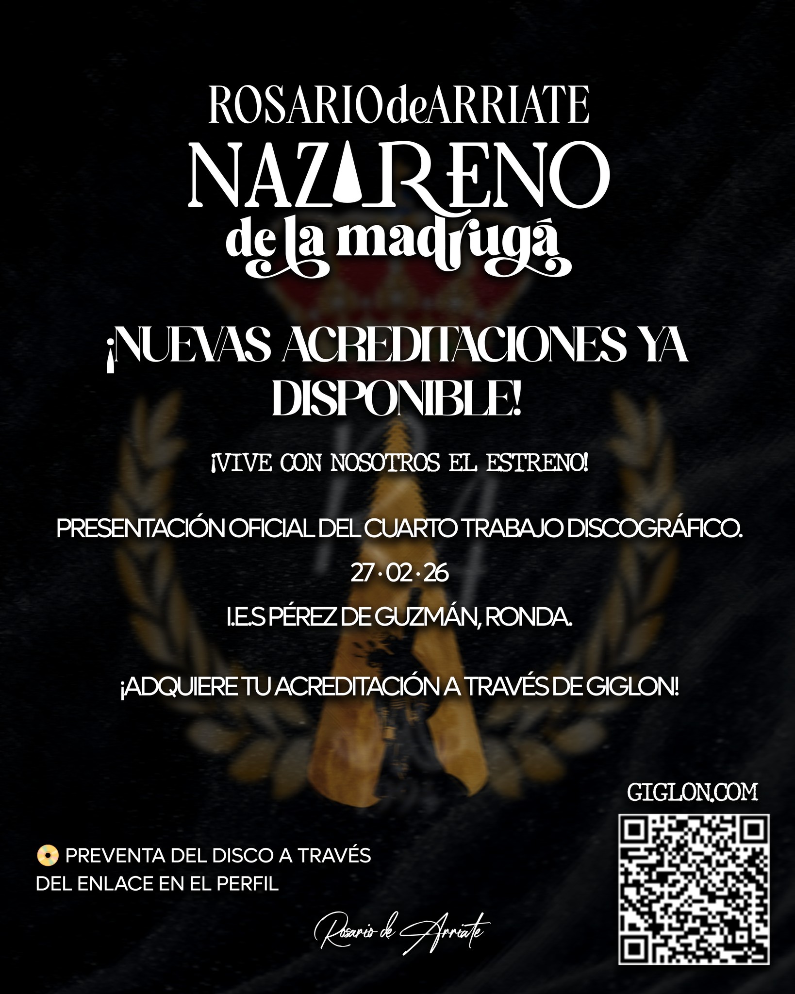 La Banda de Cornetas y Tambores Nuestra Señora del Rosario de Arriate ha anunciado el nuevo emplazamiento para la presentación de su trabajo discográfico “Nazareno de la Madrugá”, después de que el acto previsto inicialmente tuviera que suspenderse por los daños sufridos en el Teatro Vicente Espinel tras el reciente temporal.
