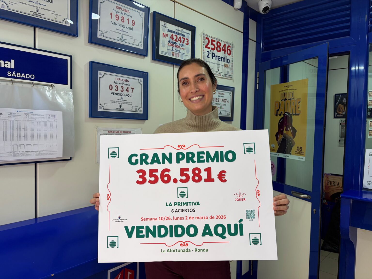 El sorteo de la La Primitiva de este pasado lunes, 2 de marzo, ha dejado en Ronda más de 350.000 euros, asociados a tres boletos de primera categoría con 6 aciertos. Uno de ellos ha sido validado en la Administración de Loterías nº 2, situada en la carrera Espinel, 9, aunque se desconoce hasta el momento la identidad de la persona afortunada.