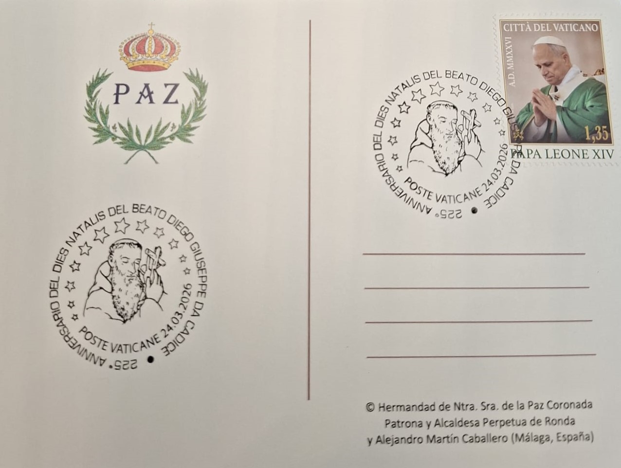 El Vaticano ha dedicado un matasellos postal al 225 aniversario de la muerte del beato Diego José de Cádiz, quien nació el 30 de marzo de 1743 y falleció en Ronda el 24 de marzo de 1801. Este matasellos ha sido solicitado al Ente Filatélico Vaticano por Fray Roberto Genuin, Ministro General de la Orden de Hermanos Menores Capuchinos.