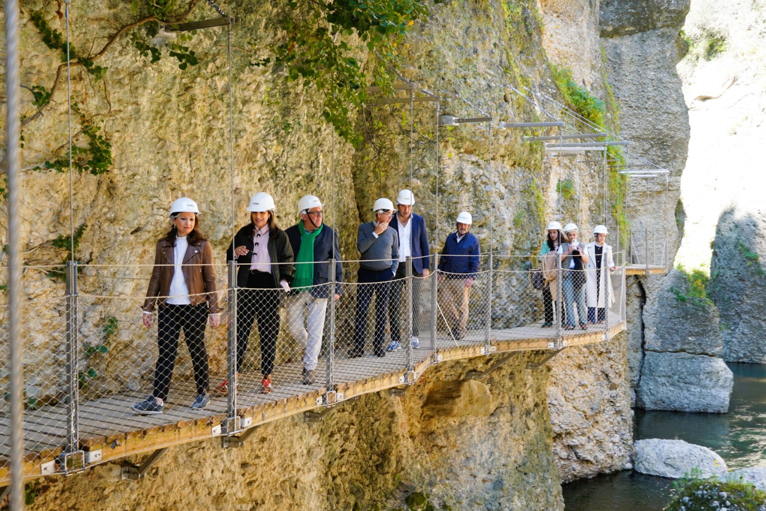 Esta visita se ha producido con carácter previo a la apertura al público de la infraestructura, en el fondo del Tajo y que permite, por tanto, adentrarse en las entrañas de la emblemática garganta, por donde discurre el río Guadalevín. Ya se abrió la primera fase, que permite bajar hasta la base del Puente Nuevo. De ahí, parte la segunda y última parte del itinerario que desemboca en la barriada de Padre Jesús, permitiendo, entre otros, disfrutar del vasto patrimonio monumental y natural de Ronda, incluidos los otros dos puentes con los que cuenta la ciudad.