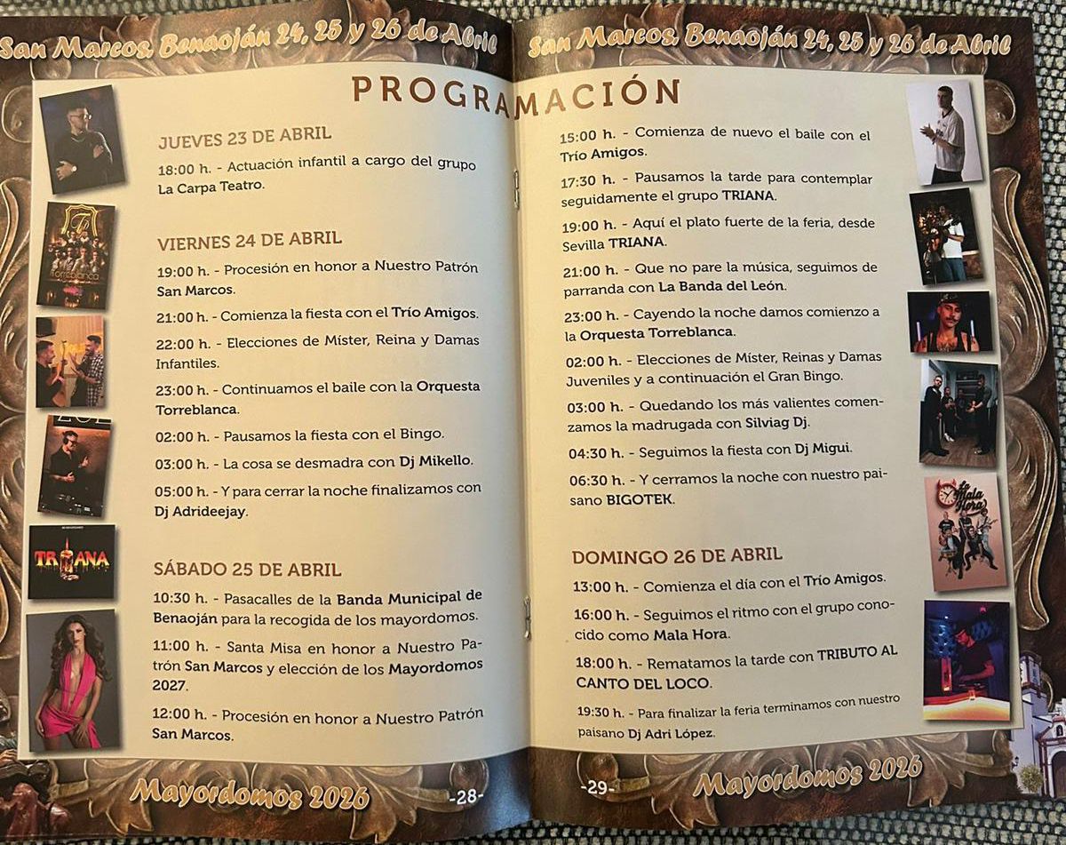 Benaoján ya cuenta las horas para el inicio de su feria y fiestas en honor a San Marcos, que se celebrarán del 24 al 26 de abril con un amplio programa de actividades para todos los públicos. Los seis mayordomos de este año ultiman estos días los detalles finales tras meses de esfuerzo para que todo esté listo de cara a un fin de semana muy esperado en el municipio. Los encargados este año son: José Miguel Pacheco, Carlos Matoso, José López, Lucas Castaño, Jorge Amaya y Salvador Álvarez.